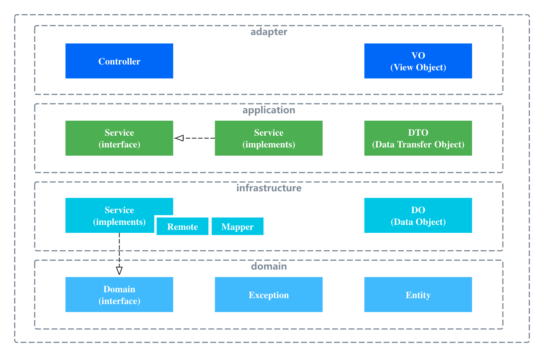 - 职责:实现领域层和应用层定义的接口和类,提供具体的技术实现,例如数据库访问对象(Repository)、消息传递机制、文件处理等。